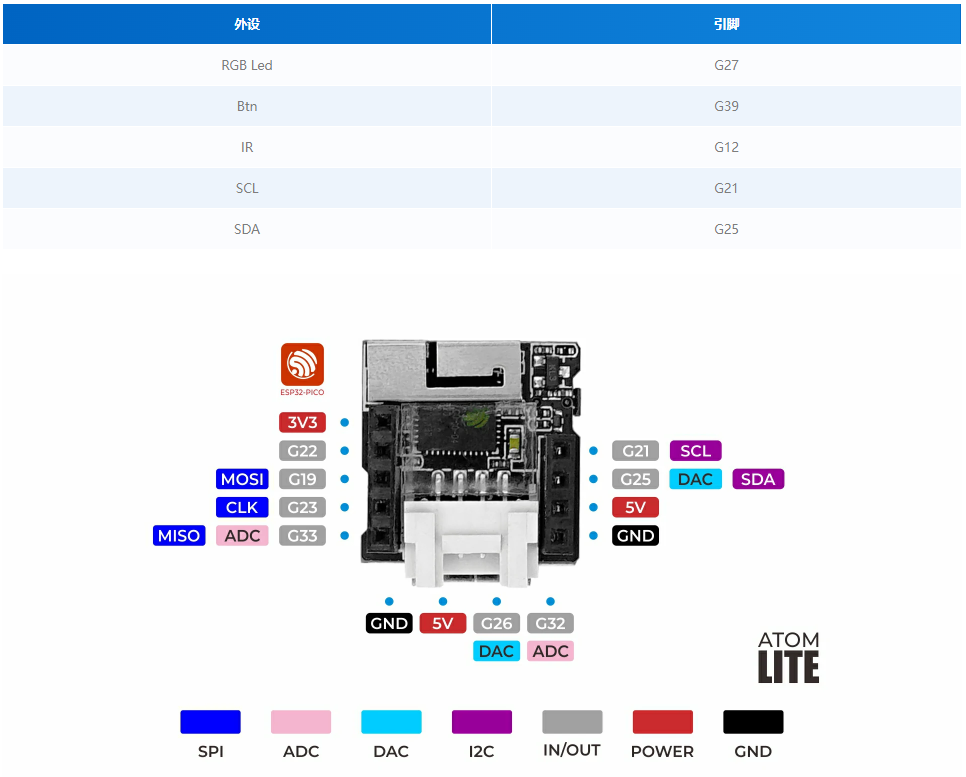 Atom Lite, which has a size of only 24*24mm, is a very compact development board in the M5Stack development kit series. It provides more GPIOs for user customization which is very suitable for embedded smart home devices and in making smart toys. The main control adopts the ESP32-PICO chip which comes integrated with Wi-Fi technologies and has a 4MB of integrated SPI flash memory. Atom Lite board provides an Infra-Red LED, a RGB LED, buttons, and a HY2.0 interface. In addition, it can connect to external sensors and actuators through 6 GPIOs. The on-board Type-C USB interface enables rapid program upload and execution.