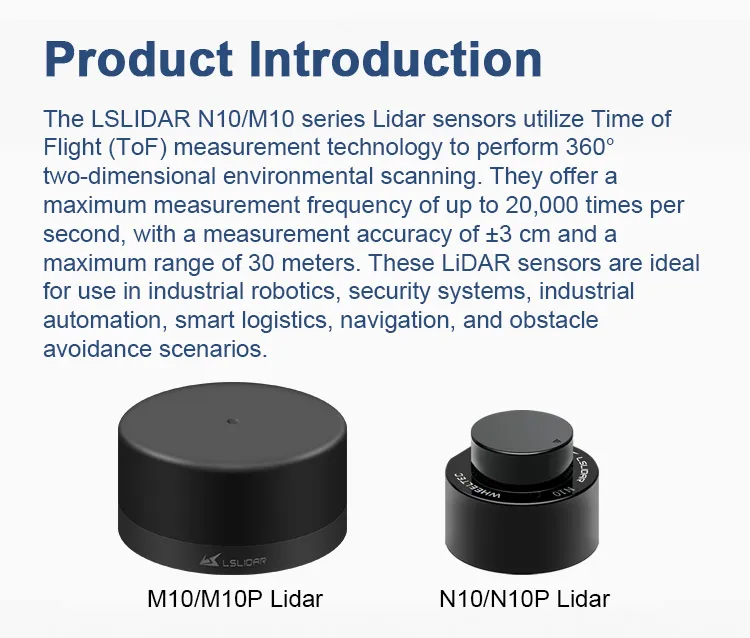 The WHEELTEC LSLIDAR N10P lidar scanner is a compact and high-precision 360° laser scanning sensor with a maximum detection range of 25 meters. Powered by advanced Time-of-Flight (TOF) technology, it delivers high stability, excellent resistance to ambient light, and precise distance measurement—suitable for both indoor and outdoor environments.